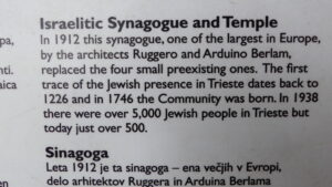 Tras el final de la contienda mundial, y una vez que en virtud de un arbitraje internacional la ciudad fue adjudicada a Italia y no a Yugoslavia, como pretendían las autoridades de Belgrado, la comunidad judía comenzó de nuevo sus actividades y la sinagoga abrió de nuevo sus puertas. Sin embargo, en los últimos tiempos ha decrecido mucho y también se ha envejecido, según me contaron algunos de sus miembros; actualmente cuenta con algo más de 500 miembros y a la baja.